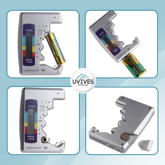 Battery tester with LCD display for AA, AAA, 9V and button cells – compact and easy to use